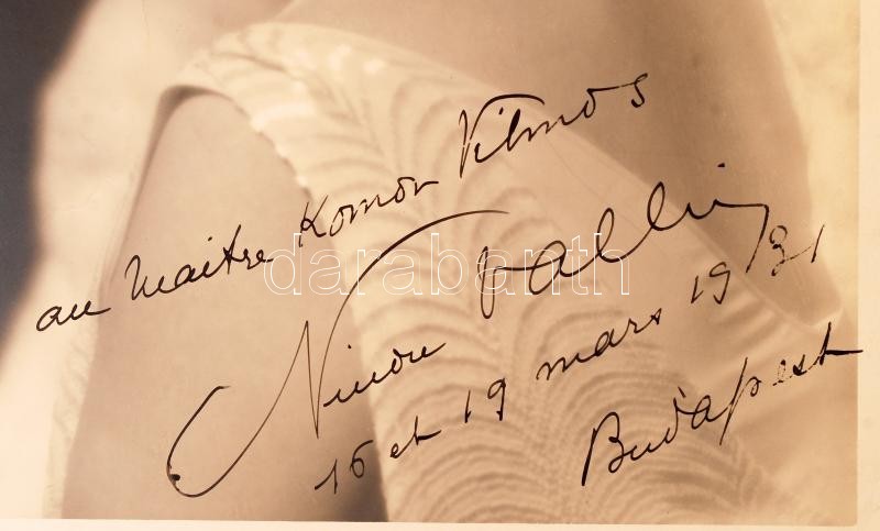 1931 Ninon Vallin francia operaénekesnő (1886-1961) portréja. Studio Lorelle, Párizs. Dedikálva Komor Vilmos (1895-1971) karmesternek, 1931. márc. 16-19. / Autograph signed photo of opera singer Ninon Vallin 22×28 cm