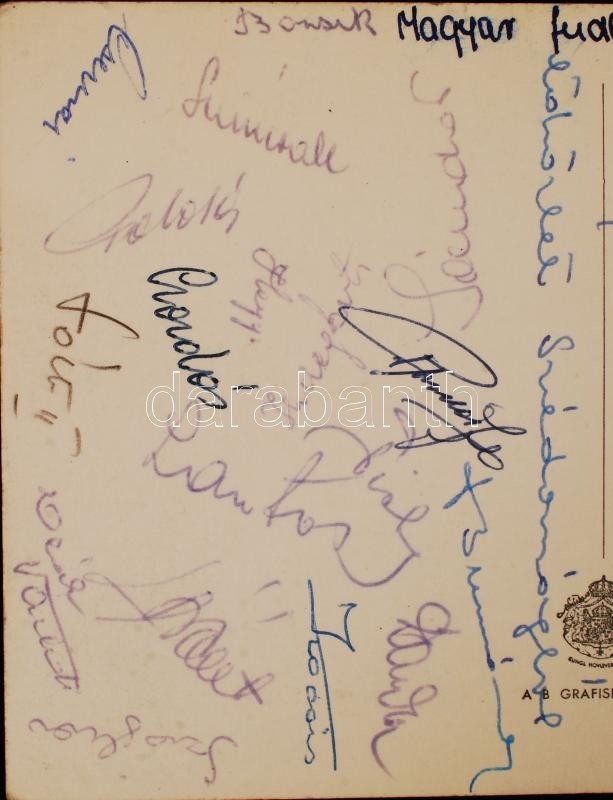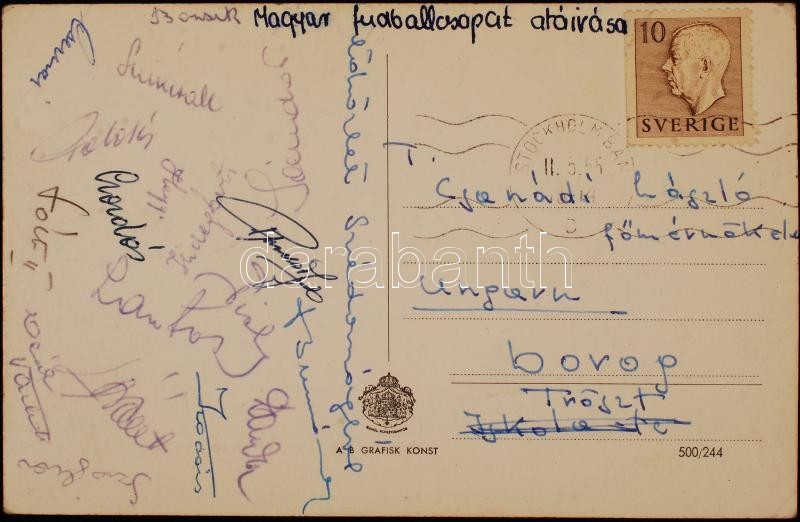 1955 Az Aranycsapat tagjai (Puskás, Buzánszky, Grosics, Bozsik...) által aláírt képeslap a stockholmi EB selejtezőről / Autograph signed postcard of the Hungarian Golden Team