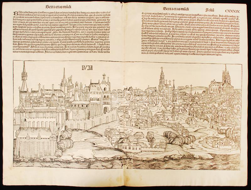 Buda fametszetű látképe Hartmann Schedel: Liber Chronicarum (Nürnberg, 1493) című munkájának latin nyelvű első kiadásából. Buda első ismert ábrázolása két levélre nyomtatva. Alján kis javítással.