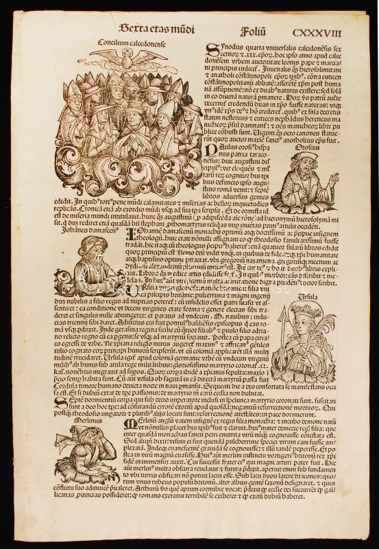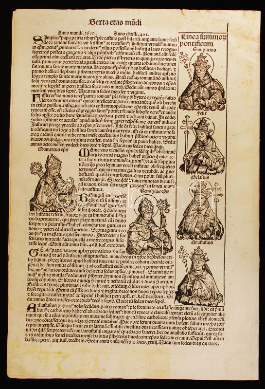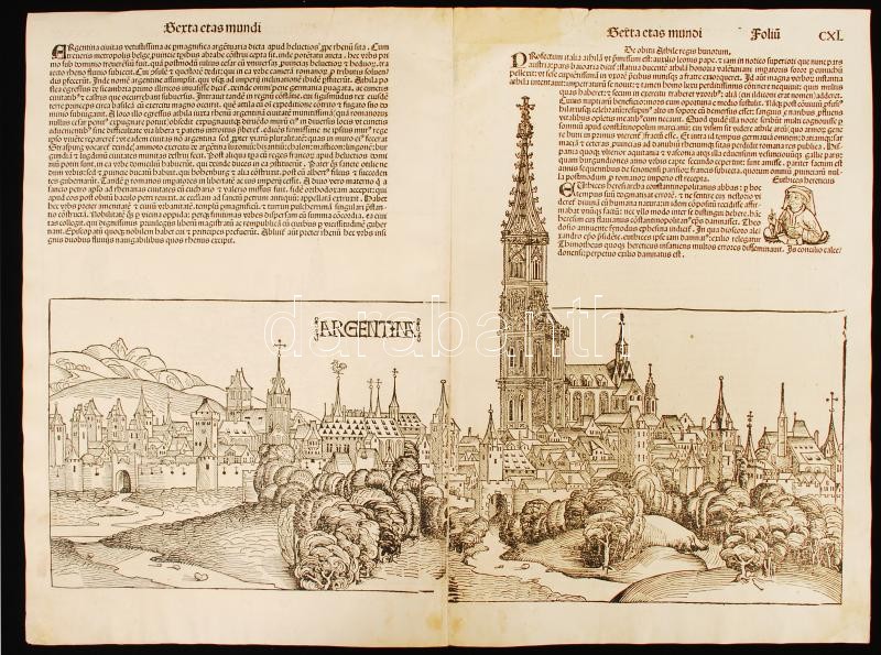 Hátoldalán Strassburg teljes fametszetű képe. További oldalakon püspökök képeivel. A metszetek valószínűleg Michael Wolgemuth és Wilhelm Pleydenwurff munkái. A Nürnbergi krónika 6 oldala jó állapotban. /
