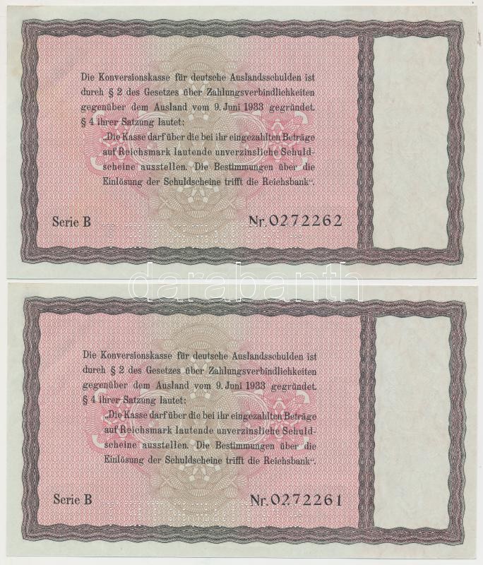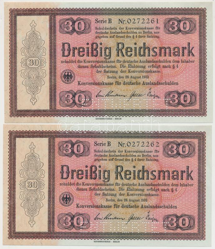 German Third Reich 1933. 30 Reichsmark with "ENTWERTET" perforation (2x) sequential serials C:AU