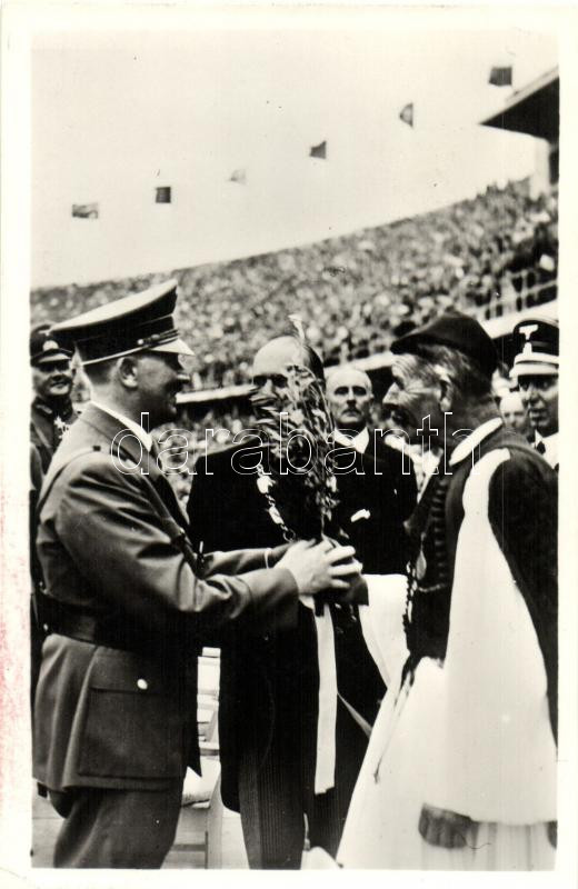 Beschreibung: Der Marathon-Sieger von Athen 1896 überreicht den Ölzweig aus Olympia / Adolf Hitler and the winner of the 1896 Olympic Games, So. Stpl