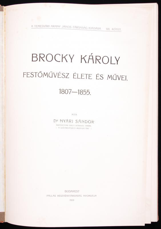 Dr. Nyári Sándor: Brocky Károly festőművész élete és művei. 1807-1855. Bp., 1910, a temesvári Arany János Társaság. Amatőr egészvászon kötésben, az eredeti borító belekötve; gazdag képanyaggal (a címkép lejár)