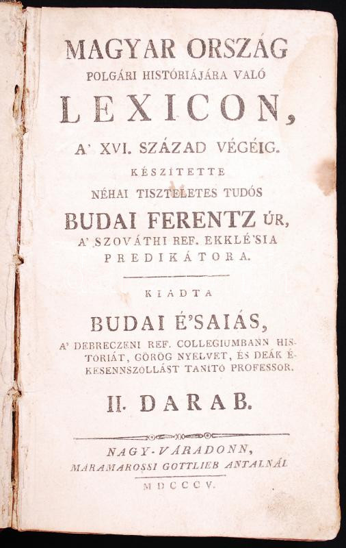 Budai Ferentz: Magyar ország polgári historiájára való lexicon, a' XVI. század végéig. Készitette néhai tiszteletes tudós -- úr... Kiadta Budai É'saiás. II. darab. Nagy-Váradonn, 1805, Máramarossi Gottlieb Antalnál. Korabeli, aranyozott félbőr kötésben, festett élmetszéssel. A kötés viseltes, a gerinc sérült, az utolsó levél fénymásolattal pótolva