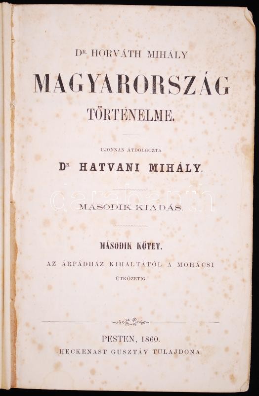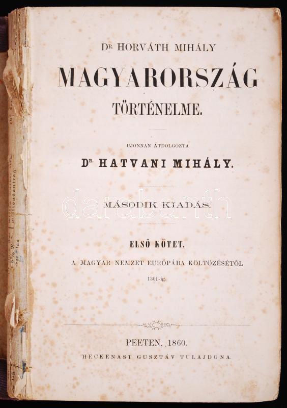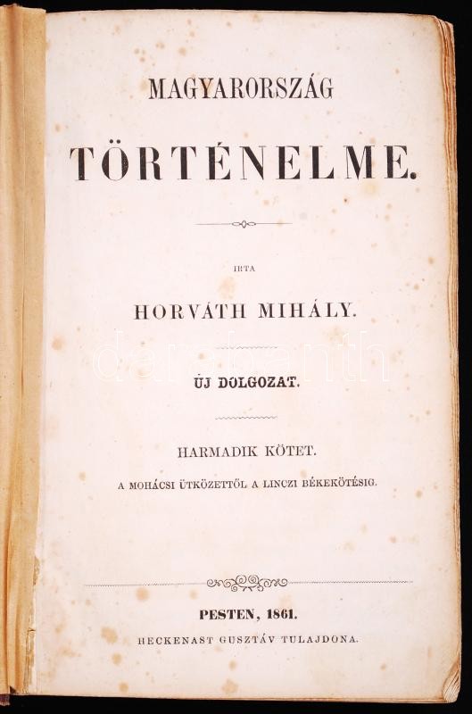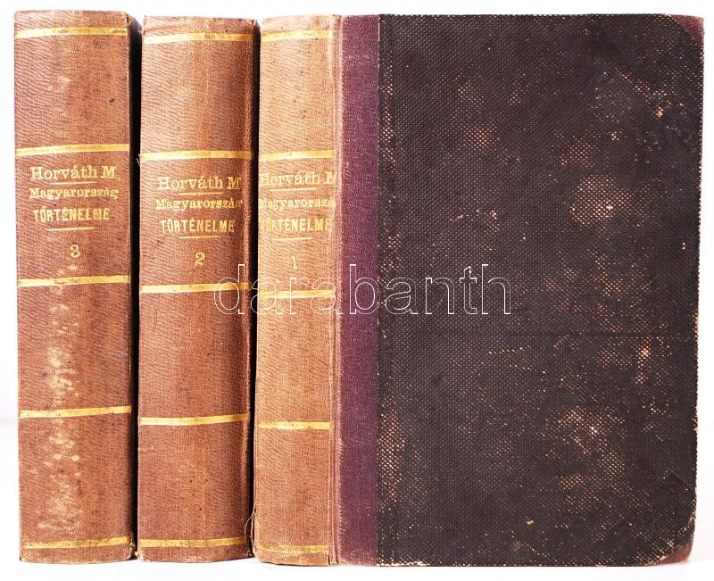 Dr. Horváth Mihály: Magyarország történelme I-III. Ujonnan átdolgozta Dr. Hatvani Mihály. Második kiadás. Pesten, 1860-1861, Heckenast Gusztáv. A hatkötetes kiadás első három darabja (!), félvászon kötésben, márványozott élmetszéssel. A kötés sérült