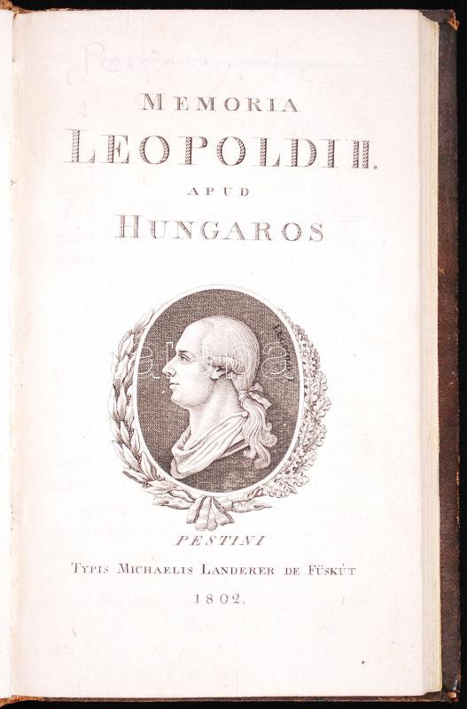 [REVICZKY József]: Memoria Leopoldi II. apud Hungaros. Pestini, 1802, typis Michaelis Landerer de Füskút. Korabeli, aranyozott gerincű, festett egészbőr kötésben, metszett címlappal, jó állapotú (az előzéklapon a korábbi tulajdonos bejegyzése, a címlapon kiradírozott ceruzás felirat látható)