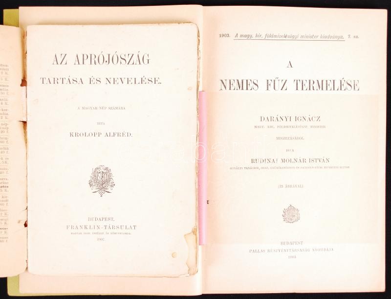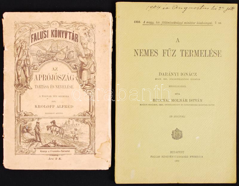 2db mezőgazdasági témájú könyv: Rudinai Molnár István: A nemes fűz termelése. 23 ábrával. Bp., 1903, a magy. kir. földmivelésügyi minister; Krolopp Alfréd: Az aprójószág tartása és nevelése. 16 képpel (Falusi Könyvtár). Bp., 1907, Franklin-Társulat. Kiadó papírborítóban