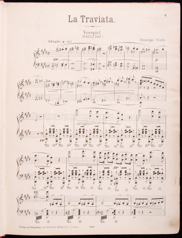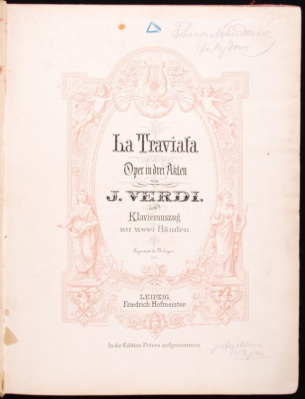 Verdi, J. [Giuseppe]: La Traviata. Oper in drei Akten. Klavierauszug zu zwei Händen. Leipzig, é.n., Friedrich Hofmeister. Kotta énekre és zongorára, kiadói, dombornyomott, szecessziós vászonkötésben, márványozott lapszélekkel (kissé kopottas, helyenként ceruzás beÃrások) /