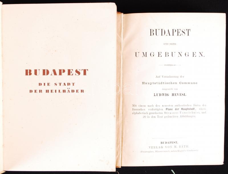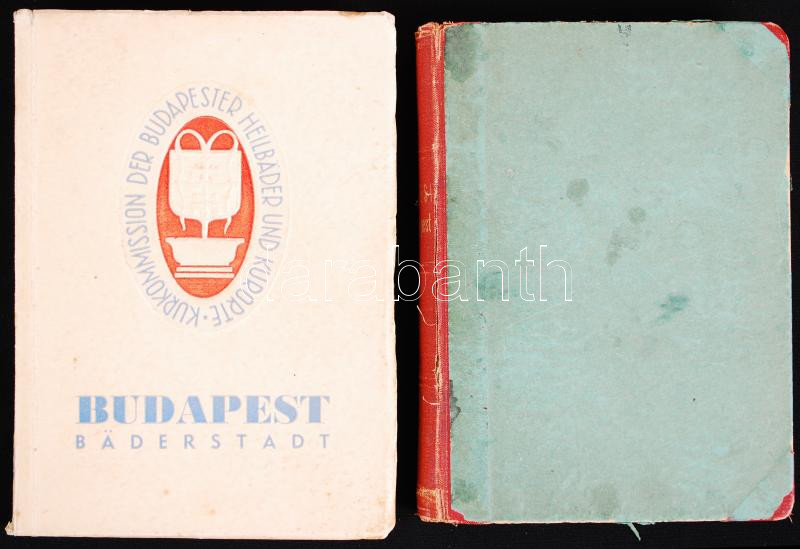 2db német nyelvű Budapest-útikalaúz: Ludwig Hevesi: Budapest und seine Umgebungen. Bp., [1873], M. Ráth. Rozoga félvászon kötésben, a térképmelléklet hiányzik; [Zoltán Szviezsényi]: Budapest Bäderstadt. Bp., é.n., Kurkommission der Budapester Heilbäder und Kurorte. Kiadói papírborítóban, gazdag képanyaggal