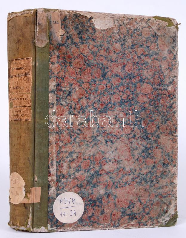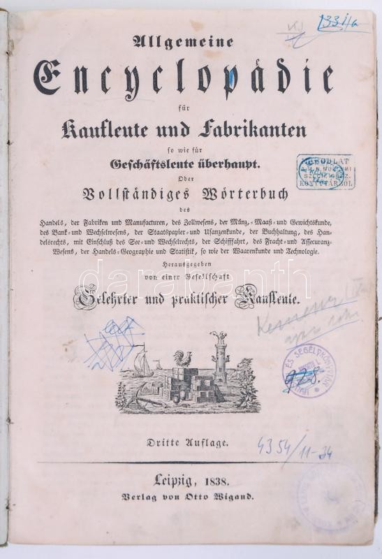 Allgemeine Enzyclopädie für Kaufleute und Fabrikanten so wie für Geschäftsleute überhaupt. Oder vollständiges Wörterbuch des Handels, der Fabriken und Manufacturen [...] hrsg. von einer Gesellschaft gelehrter und praktischer Kaufleute. Dritte Auflage. Leipzig, 1838, Otto Wigand. Korabeli félvászon kötésben, a címoldalon fametszet vignettával (a kötés viseltes állapotú) /