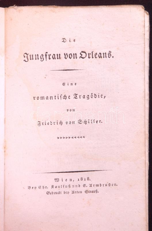 Friedrich von Schiller: Die Jungfrau von Orleans. Eine romatische Tragödie - -. Wien, 1818, Kaulfuß u. Armbruster. Kiadói kartonkötésben, címképmetszettel, az első néhány lap foltos, részben felvágatlan /