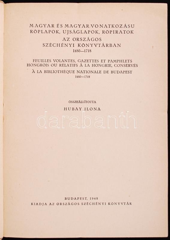 Hubay Ilona: Röplapok, újságlapok, röpiratok 1480-1718. Budapest, 1948... https://www.darabanth.com/de/190-Fernauktion/190.0/Andere-Sammelgebiete/Bucher-Sonstige-Raritaten~800044/Hubay-Ilona-Roplapok-ujsaglapok-ropiratok-1480-1718-Budapest-1948-Orszagos-Szechenyi-Ko~II699132