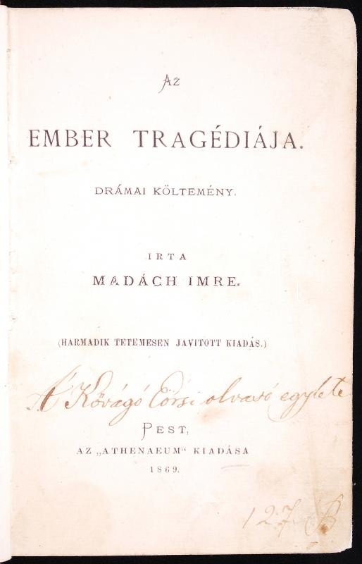 Madách Imre: Az ember tragédiája. Drámai költemény. Harmadik tetemesen javított kiadás. Pest, 1896, Athenaeum. Korabeli félvászon kötésben, festett élmetszéssel