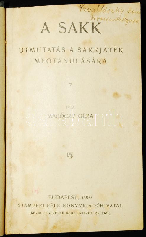Maróczy Géza: A sakk. Útmutató a sakkjáték megtanulására. Budapest 190... https://www.darabanth.com/de/190-Fernauktion/190.0/Andere-Sammelgebiete/Bucher-Sonstige-Raritaten~800044/Maroczy-Geza-A-sakk-Utmutato-a-sakkjatek-megtanulasara-Budapest-1907-Stampfel-Foltos~II717060