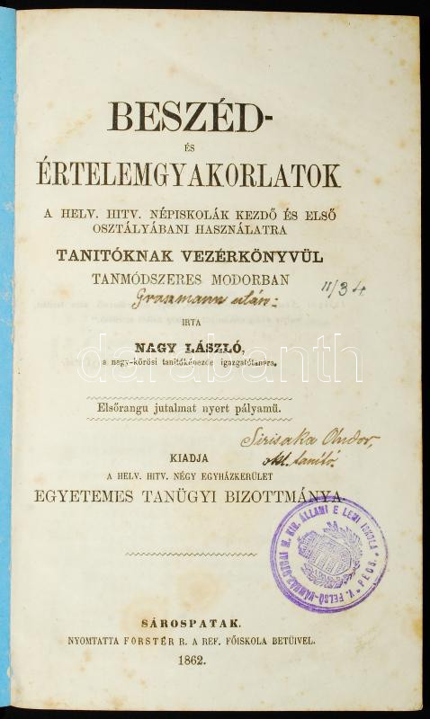 Nagy László: Beszéd és értelemgyakorlatok. A helv. hitv. népiskolák kezdő és első osztályábani használatra tanitóknak vezérkönyvül. Sárospatak, 1862, A helv. hitv. négy egyházkerület egyetemes tanügyi bizottmánya. Újrakötve, félvászon kötésben