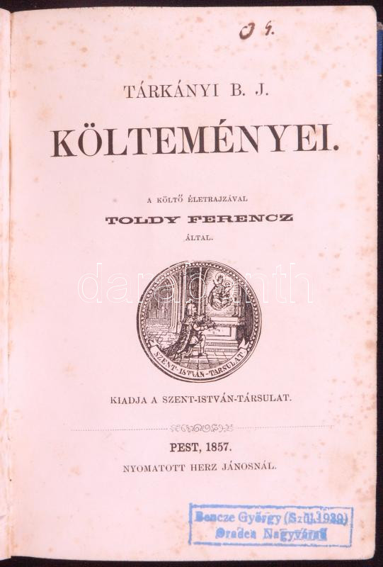Beschreibung: Tárkányi Béla József költeményei. Szerk: Toldy Ferenc. Pest, 1857, Szent István Társulat. Félvászon kötésben, a kötés belül levált
