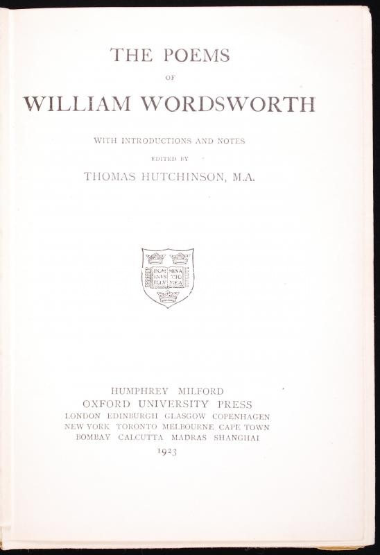 Wordsworth, William: The Poems of - -. Ed. by Thomas Hutchinson. London, 1923, Humphrey Milford - Oxford University Press. Kiadói, aranyozott, egészvászon kötésben, a szerző metszett portréjával és aláírásával, szép állapotú /
