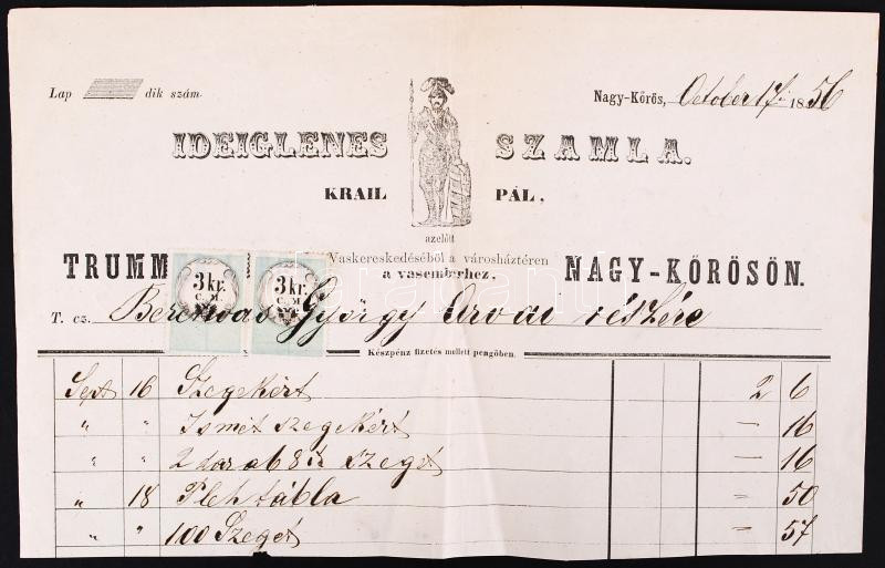 1856 Nagykőrös Krail vaskereskedés számla 2x3kr CM okmánybélyeggel https://www.darabanth.com/de/190-Fernauktion/190.0/Andere-Sammelgebiete/Dokument~800026/1856-Nagykoros-Krail-vaskereskedes-szamla-2x3kr-CM-okmanybelyeggel~II717870