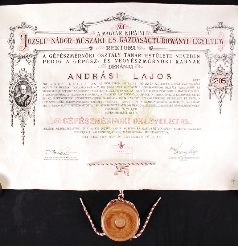1936 ... https://www.darabanth.com/de/190-Fernauktion/190.0/Andere-Sammelgebiete/Dokument~800026/1936-Gepeszmernoki-pergamen-oklevel-szep-fuggo-viaszpecsettel--3Cbr3E1936-Ingeniur-pergami~II709771