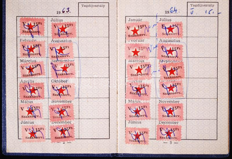 1962 Szakszervezeti tagsági könyv sok bélyeggel https://www.darabanth.com/de/190-Fernauktion/190.0/Andere-Sammelgebiete/Dokument~800026/1962-Szakszervezeti-tagsagi-konyv-sok-belyeggel~II701298