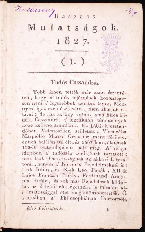 1827 Hasznos Mulatságok. Első fél évfolyam (1-52. szám), korabeli papírkötésben, a lapok foltosak, az előzéklap és néhány további lap a kötet elejéről sérült