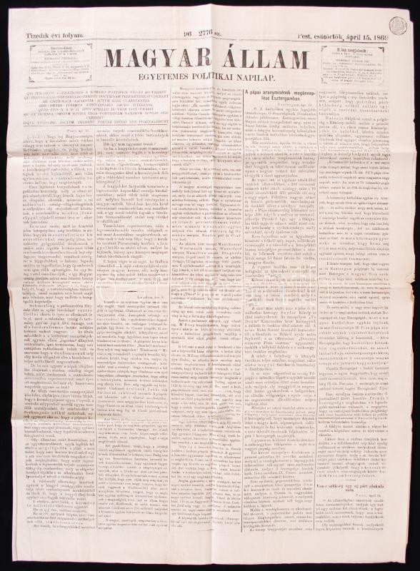 1869. ápr. 15. Magyar Állam. Egyetemes politikai napilap. Szignettával https://www.darabanth.com/de/190-Fernauktion/190.0/Andere-Sammelgebiete/Drucksachen~800042/1869-apr-15-Magyar-Allam-Egyetemes-politikai-napilap-Szignettaval~II699650