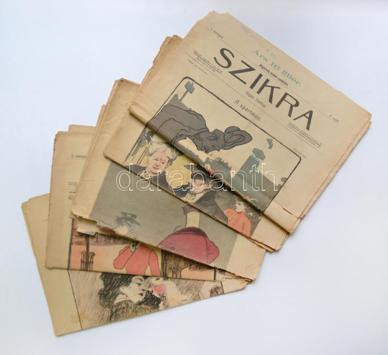 1903-1904 Szikra. Képes Hetilap. I/2-4., II/11-12. szám. Többek között Feiks Jenő, Kubinyi Sándor, Márk Lajos, Keményffy Jenő, Bér Dezső, Fényes Adolf, Linek Lajos, Vesztróczy Manó, Garay Ákos stb. színes, egész alakos litográfiáival illusztrált élclap 4 száma Heltai Jenő, Molnár Ferenc, Kabos Ede, Ignotus, Szomaházy István stb. írásaival, viseltes állapotban