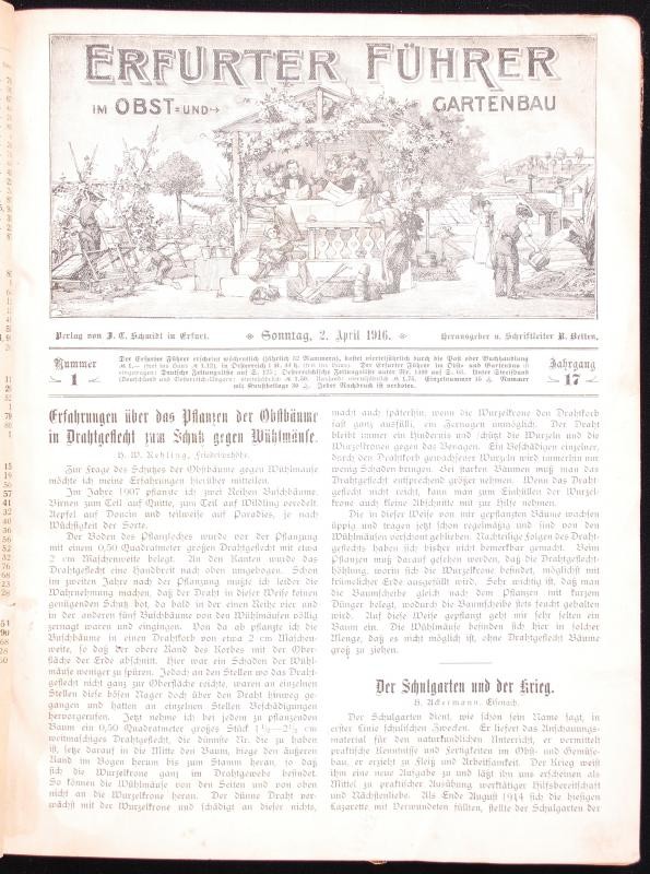 1916-1917 Erfurter Führer im Obst- und Gartenbau. Teljes évfolyam. 2 színes táblával, és számos szövegközti ábrával. Melléklet: Praktische Ratschläge für Haus und Hof. Egybekötve, félvászon kötésben, kissé viseltes /