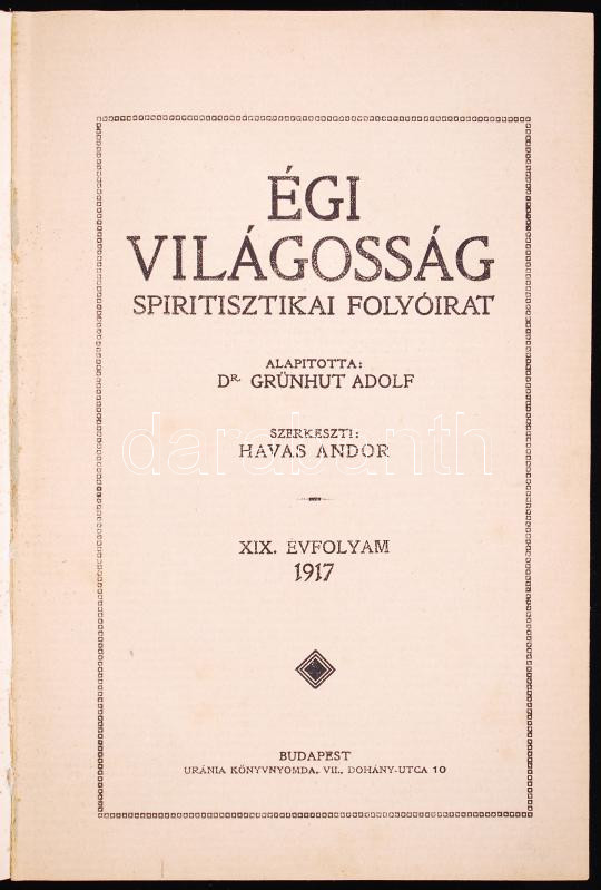 1917 Égi Világosság. Spiritisztikai folyóirat. XIX. évf. (teljes) Egyb... https://www.darabanth.com/de/190-Fernauktion/190.0/Andere-Sammelgebiete/Drucksachen~800042/1917-Egi-Vilagossag-Spiritisztikai-folyoirat-XIX-evf-teljes-Egybekotve-felvaszon-kot~II713779
