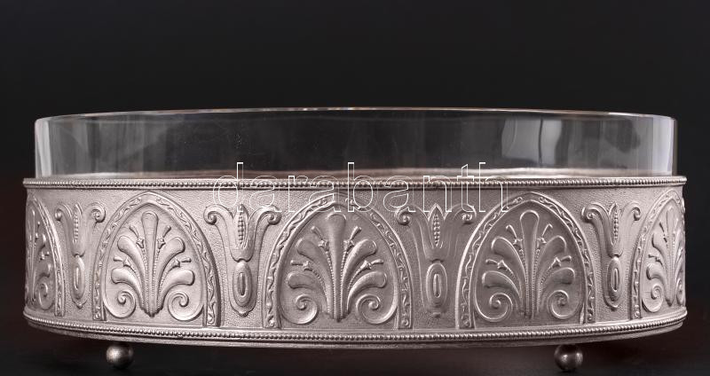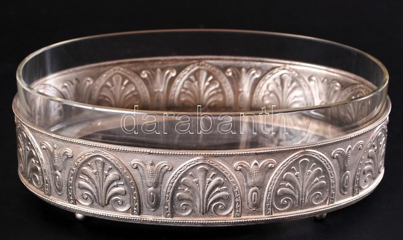 Beschreibung: Fém ovális kínálótál, jelzett, gazdagon díszített, eredeti hibátlan üvegbetéttel, m:8 cm, h:24 cm