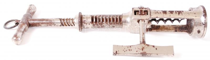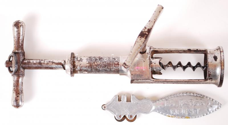 Beschreibung: Mester János és társa, BPest feliratú alumínium üvegvágó h: 10,5 cm és egy fém bornyitó, kopottas állapotban m: 19,5cm