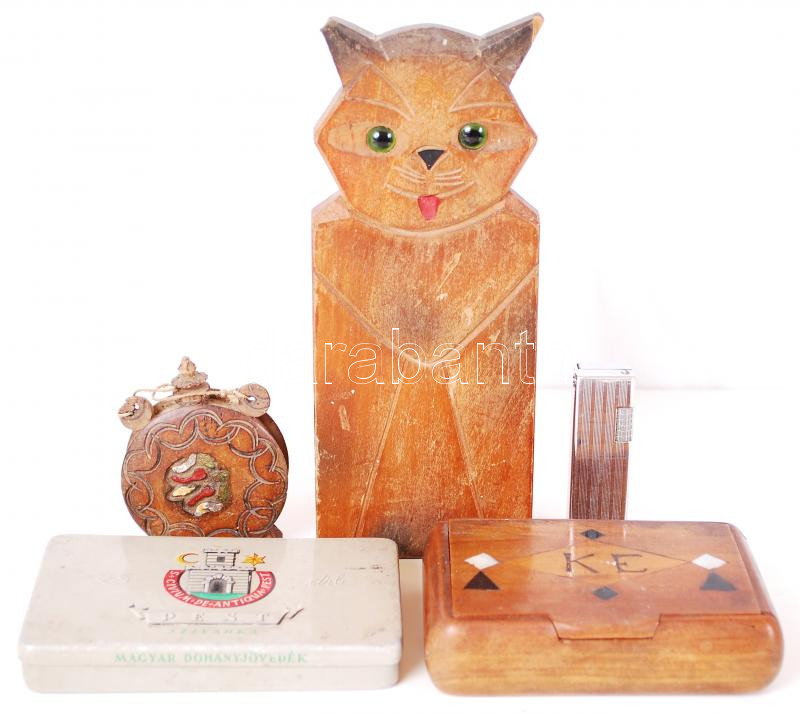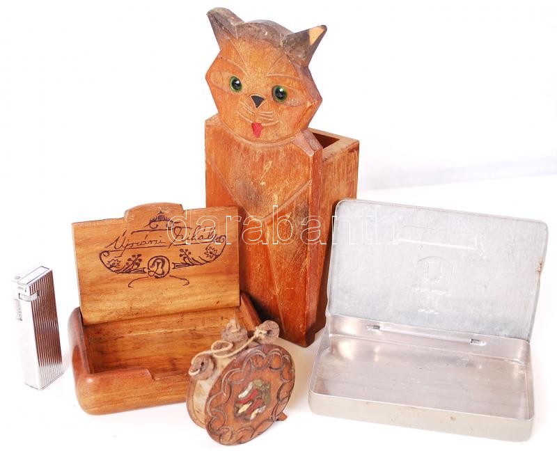 Beschreibung: Vegyes régi bolha tétel: fa szivarka, fém szivarka doboz, öngyújtó, Hercules rajzszeg, kis intarziás fa dobozka, fém öngyújtó, stb