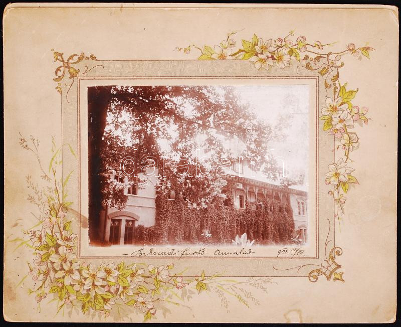 Beschreibung: 1908 2 db régi, keményhátú fénykép Bikszád-fürdőről, szépen díszített, színezett kartonra kasírozva, képméret: 9x12 cm, kartonméret: 16x20 cm