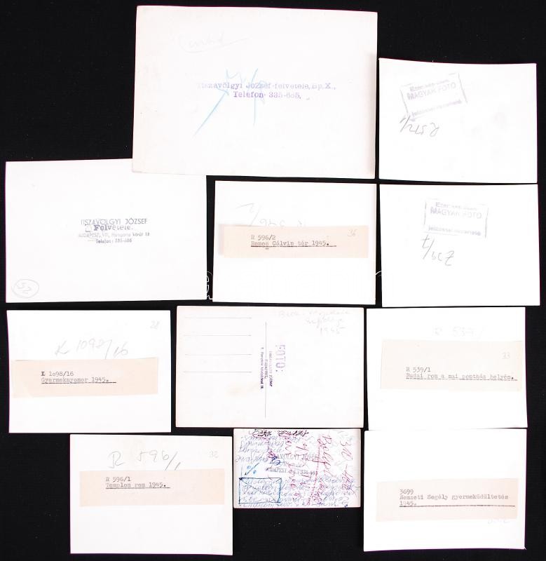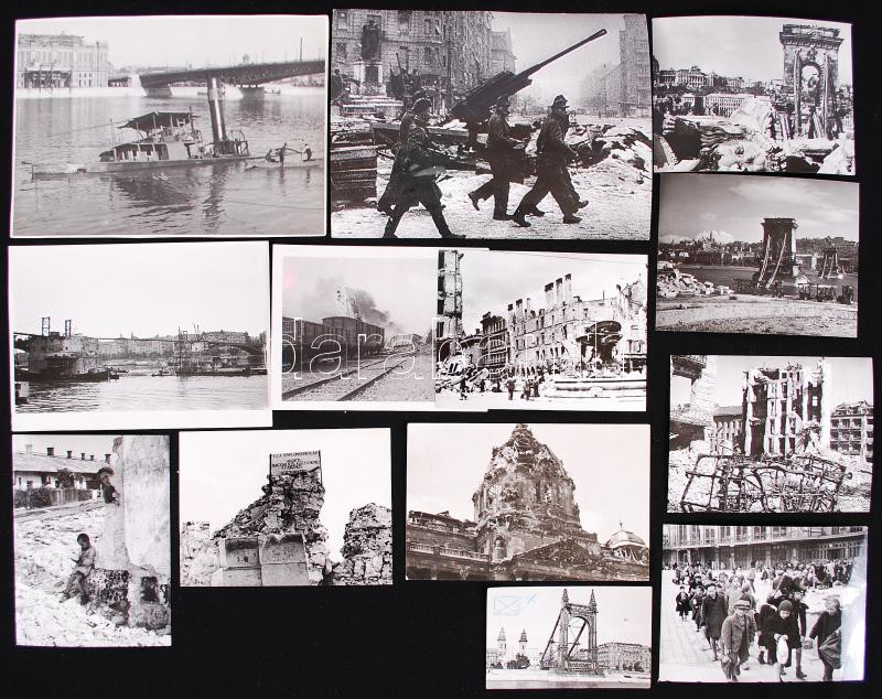 Beschreibung: 1945 13 db fotó a II. vh. pusztításáról, köztük néhány fotó Tiszavölgyi József alkotása, néhány fotó feliratozott, kfl méretben