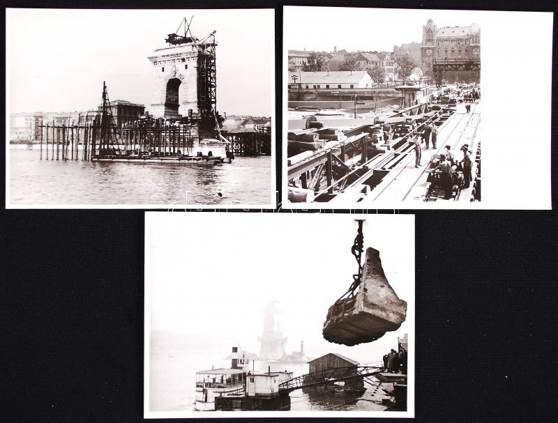 Beschreibung: 1948-1949 3db fotó a felrobbantott Lánchíd újjáépítési munkálatairól, 9x12cm