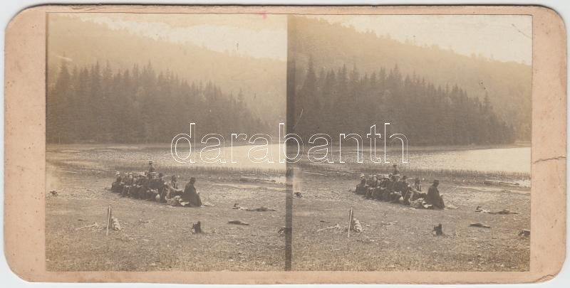 Beschreibung: Cca 1900 sztereó fotó turisták a Szent Anna-tó partján, 9×18 cm