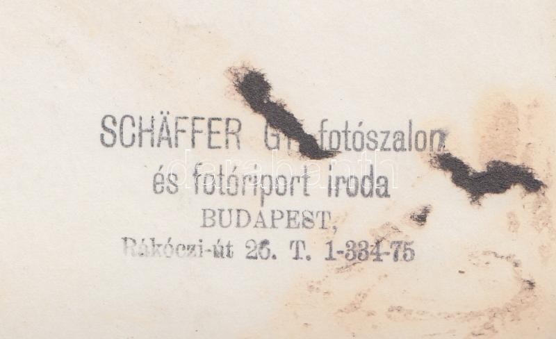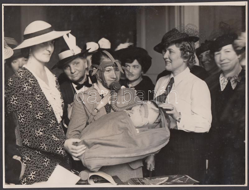 Cca 1942 Régi fotó a polgári védelemről, gázálarccal felszerelt anyuka és pólyás babája háborús helyzetben. Schäffer fotószalon és fotóriport iroda pecsétjével a hátoldalon, 18x24 cm