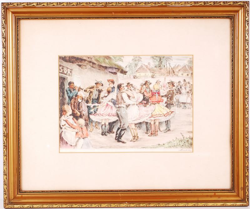 Beschreibung: Paulovits Pál (1892-1975): Mulatság. Színezett rézkarc, papír, jelzett, üvegezett keretben, 35×25 cm