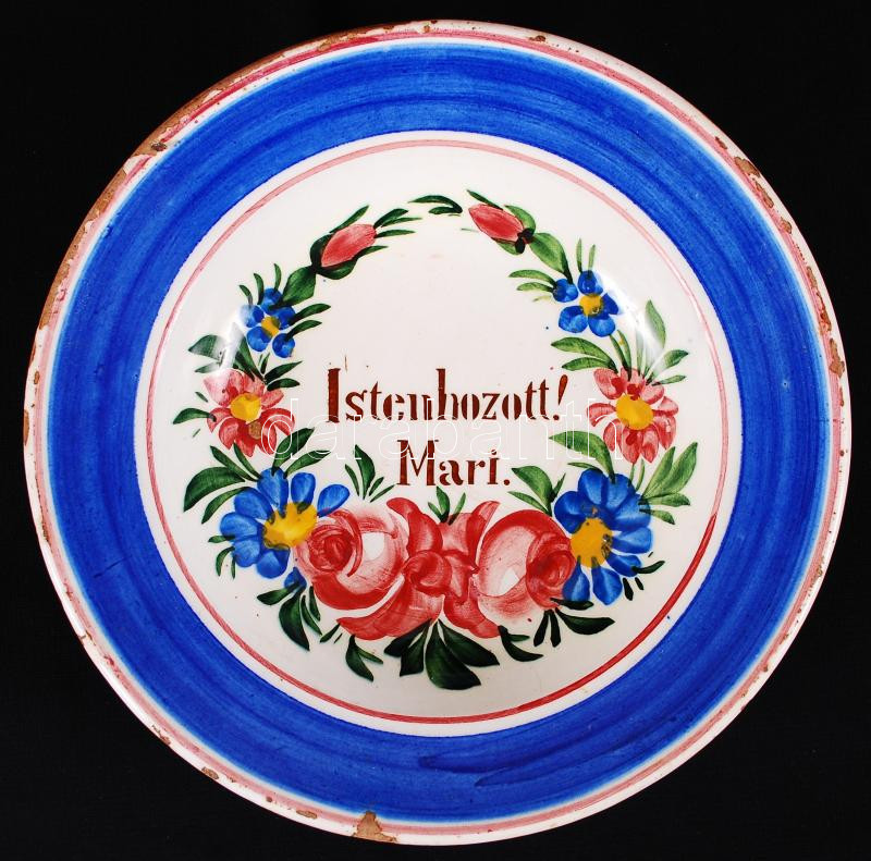 XIX. sz Isten hozott Mari feliratos jelzett miskolci kerámia tányér, k... https://www.darabanth.com/de/190-Fernauktion/190.0/Andere-Sammelgebiete/Keramiken~800005/XIX-sz-Isten-hozott-Mari-feliratos-jelzett-miskolci-keramia-tanyer-kezzel-festett-koranak-me~II716314