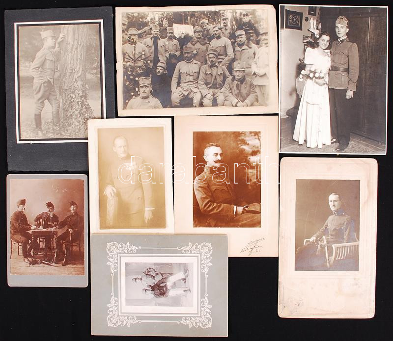 Beschreibung: 1900-1930 8 db kfl méretű katonai fénykép, nagy részük kartonra ragasztott