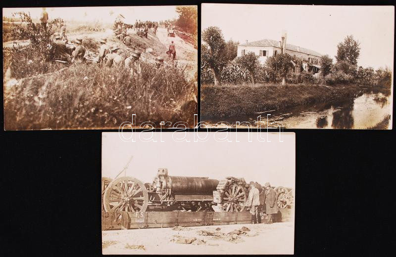 1914-1918 3db, hátoldalán feliratozott, I. világháborús fotó az olasz frontról: lövészárok katonákkal, elfoglalt épület, zsákmányolt olasz mozsárágyú /
