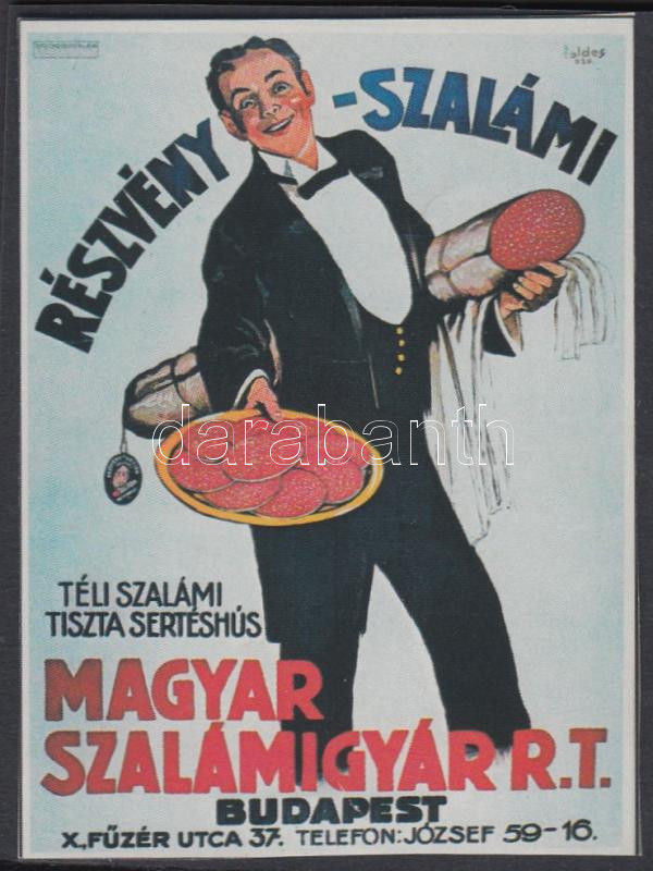 1930 Magyar Szalámigyár R.T., Részvény-Szalámi, propaganda bélyeg https://www.darabanth.com/de/190-Fernauktion/190.0/Andere-Sammelgebiete/Paraphilatelie~800022/1930-Magyar-Szalamigyar-RT-Reszveny-Szalami-propaganda-belyeg~II717817