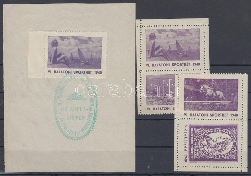 Beschreibung: 1940 VI. Balatoni Sporthét, 4db levélzáró + 1db levélzáró papíron, alkalmi bélyegzéssel, lila színben