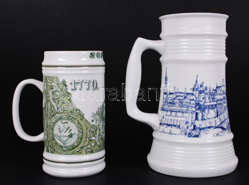 Beschreibung: Hollóházi Sopron 1770-1982 korsó és Alföldi városképes korsó, matricásak, jelzettek, hibátlanok, 16-20 cm