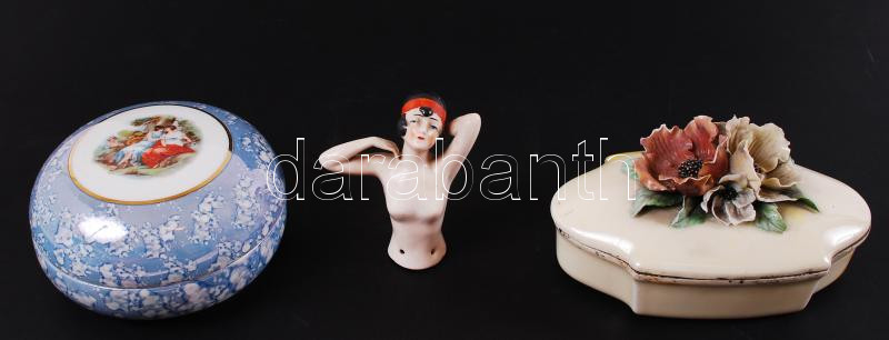Beschreibung: Porcelán tétel: Matricás bonbonier, rózsás (sérült) bonbonier, art-decos női akt (hiányos)