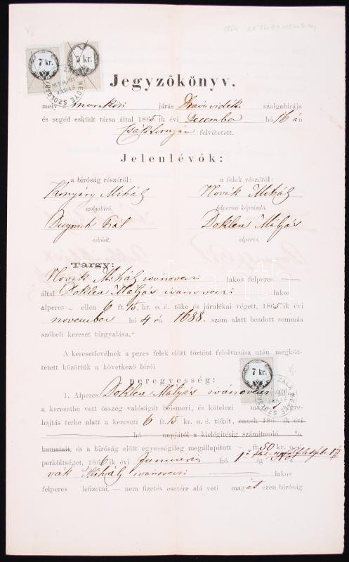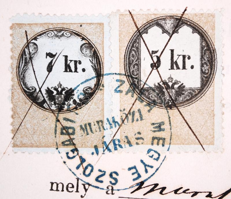 Beschreibung: 1865 Tárgyalási jegyzőkönyv 5krB + 2x7krA, vízjeles, keskenyre fogazott illetékbélyeggel