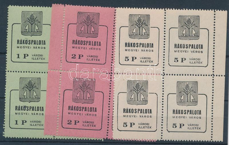 Beschreibung: 1945 Rákospalota 1P, 2P, 5P okmánybélyeg négyestömbök (40.000)
