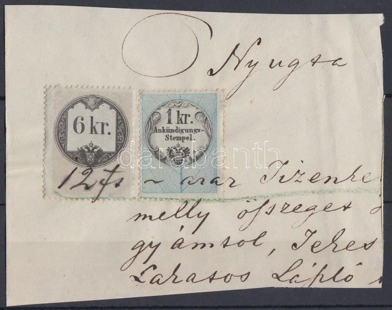 Nyugta-darab okmánybélyeg + Hirdetménybélyeg vegyes felhasználással https://www.darabanth.com/de/190-Fernauktion/190.0/Andere-Sammelgebiete/Stempelmarken~800024/Nyugta-darab-okmanybelyeg-plus-Hirdetmenybelyeg-vegyes-felhasznalassal~II717064