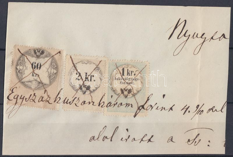 Beschreibung: Nyugta-darab okmánybélyeg + Hirdetménybélyeg vegyes felhasználással