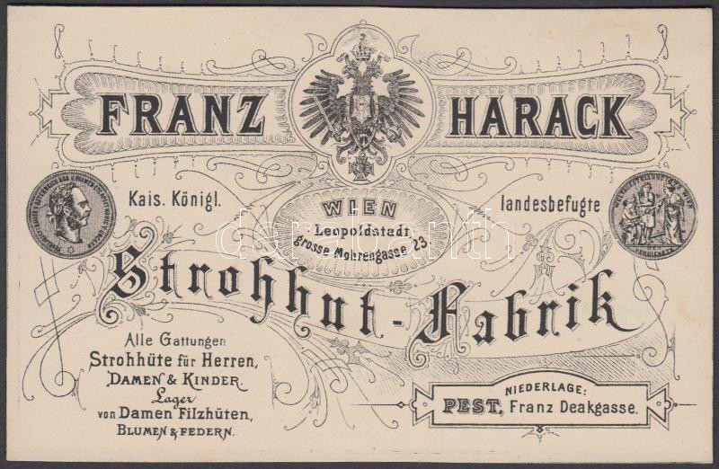 1876 Budapest V. Harack szalmakalap készítő reklámkártya és számla https://www.darabanth.com/de/190-Fernauktion/190.0/Andere-Sammelgebiete/Werbungen~800033/1876-Budapest-V-Harack-szalmakalap-keszito-reklamkartya-es-szamla~II714968